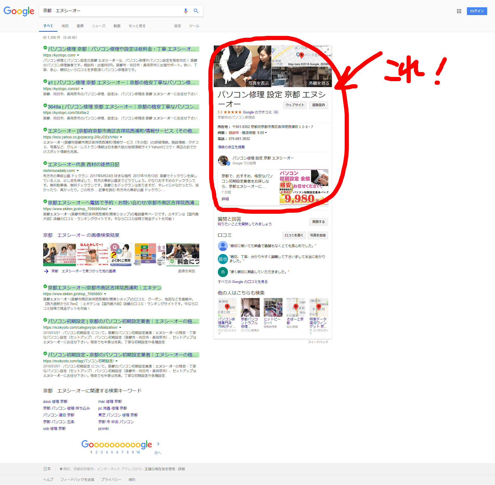 当店でも「エヌシーオー」とGoogleで検索すると、パソコンでいうと、右側に下記のように表示される部分のことです。
