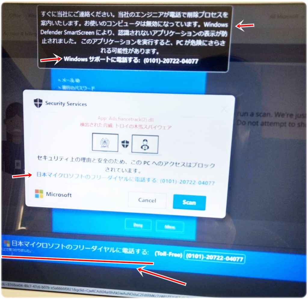 表示される内容は偽物なのに、マイクロソフトのロゴ風画像や日本語の警告音が出るので、慌てて電話番号を押してしまう方が多いです。でもこの時点でもう詐欺グループの思う壺。これがいわゆる「サポート詐欺」と言われる手口です。